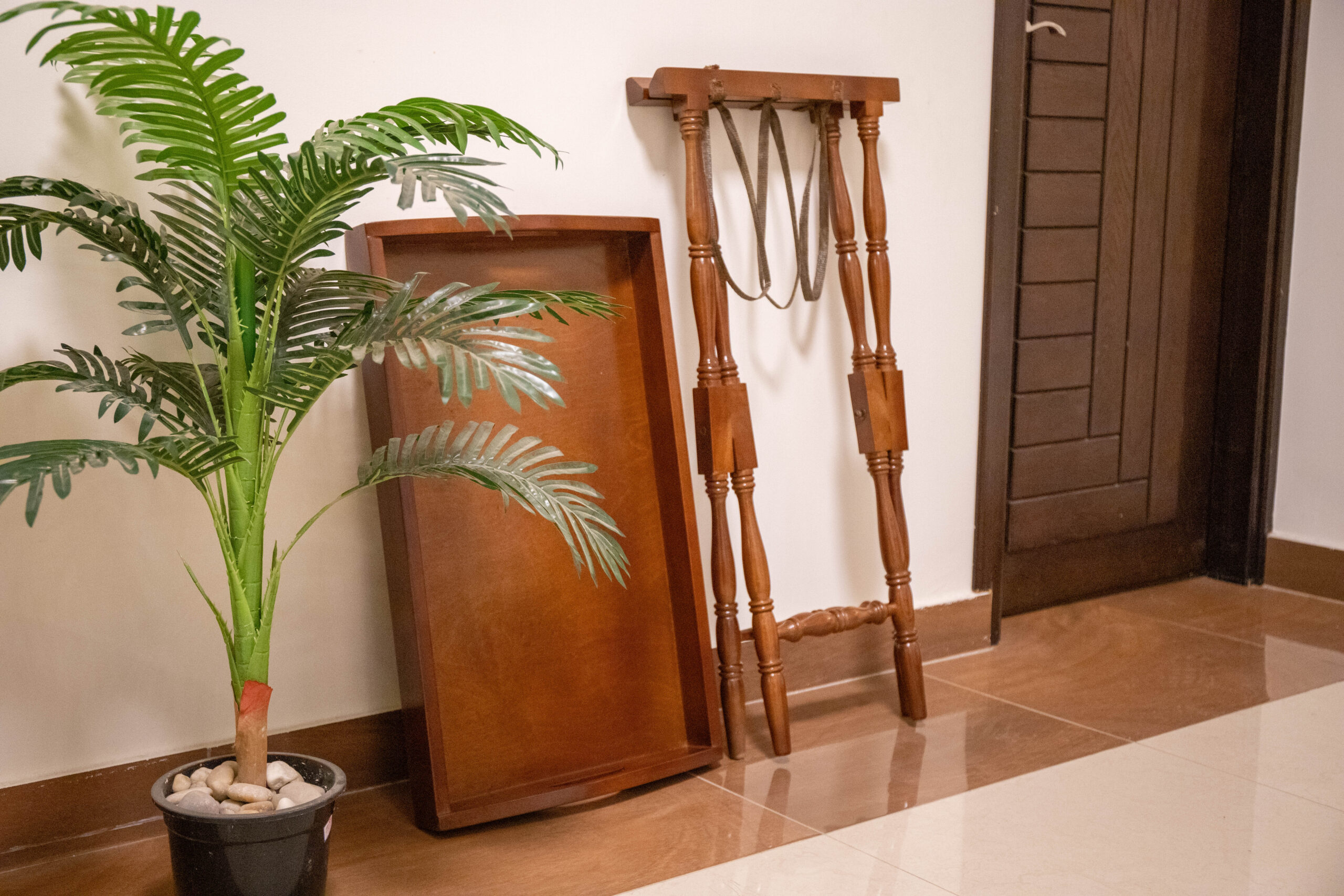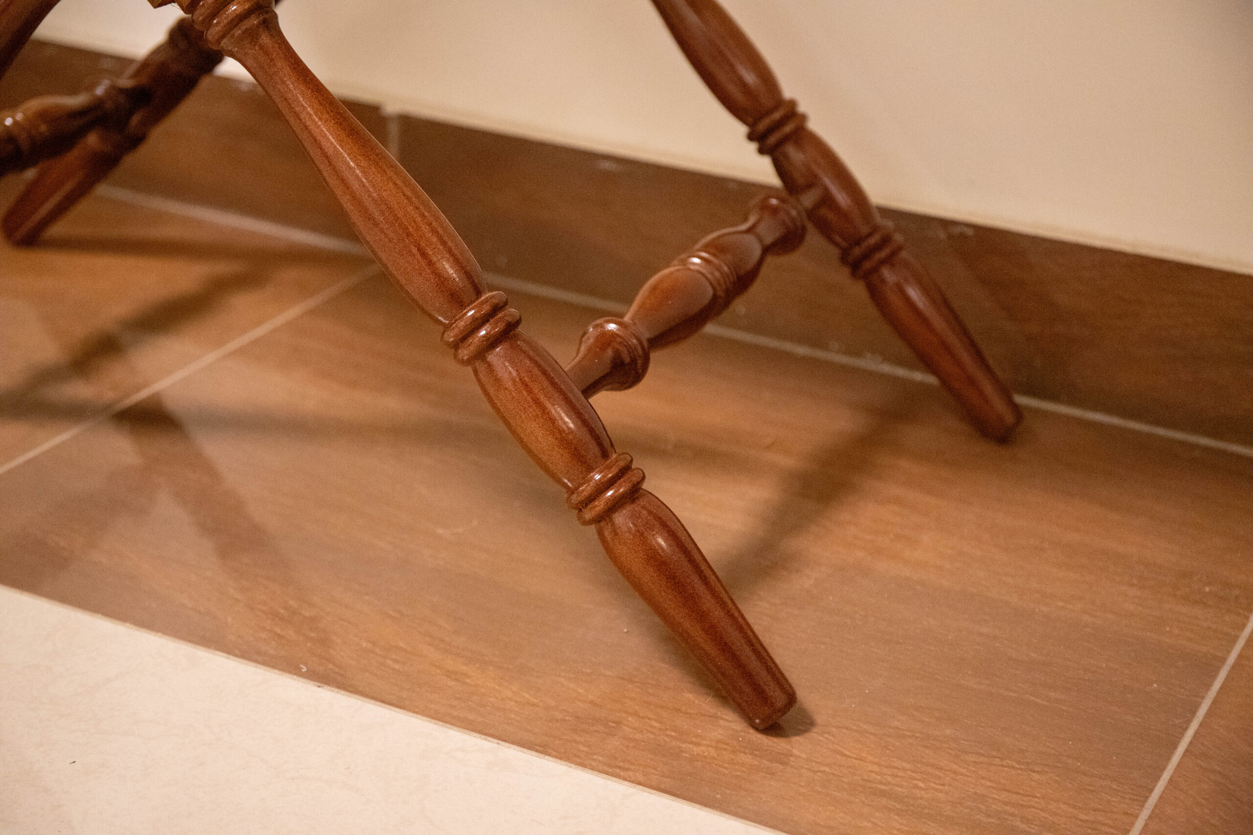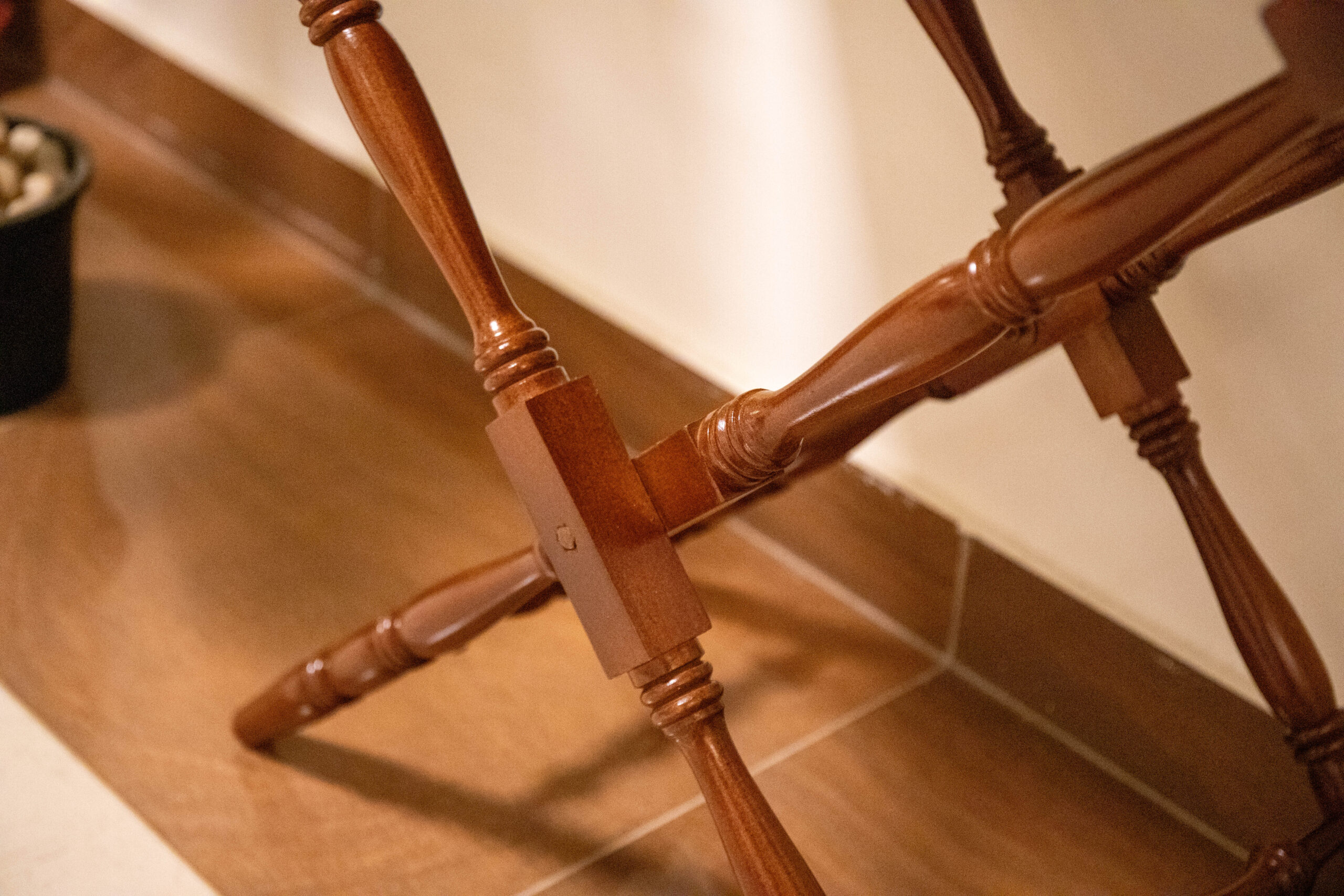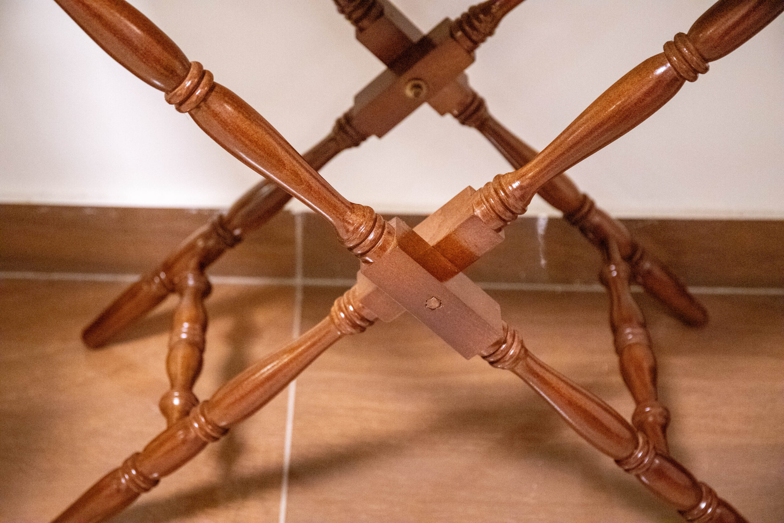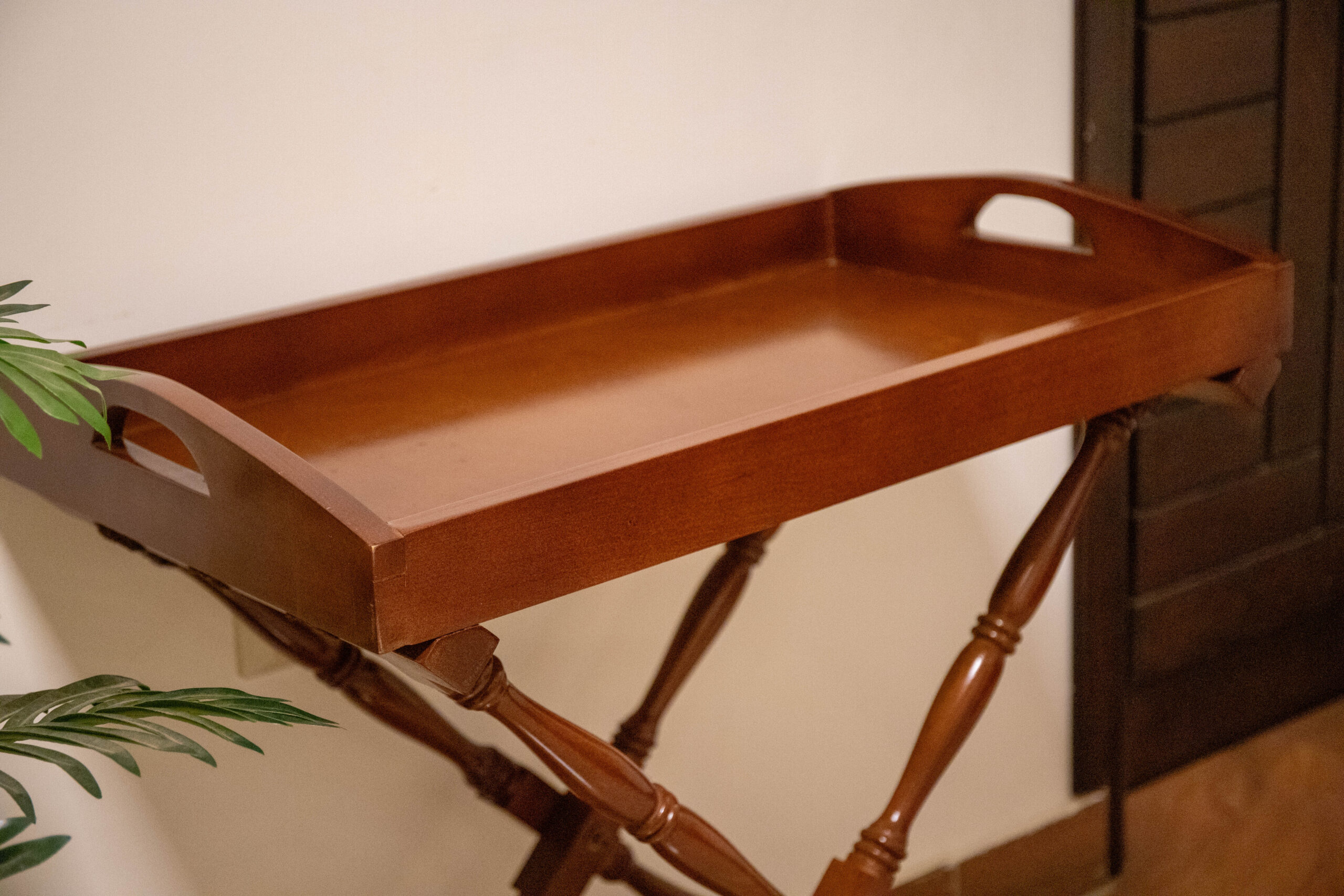 Serving tray table on a foldable carved stand from natural Beech wood.