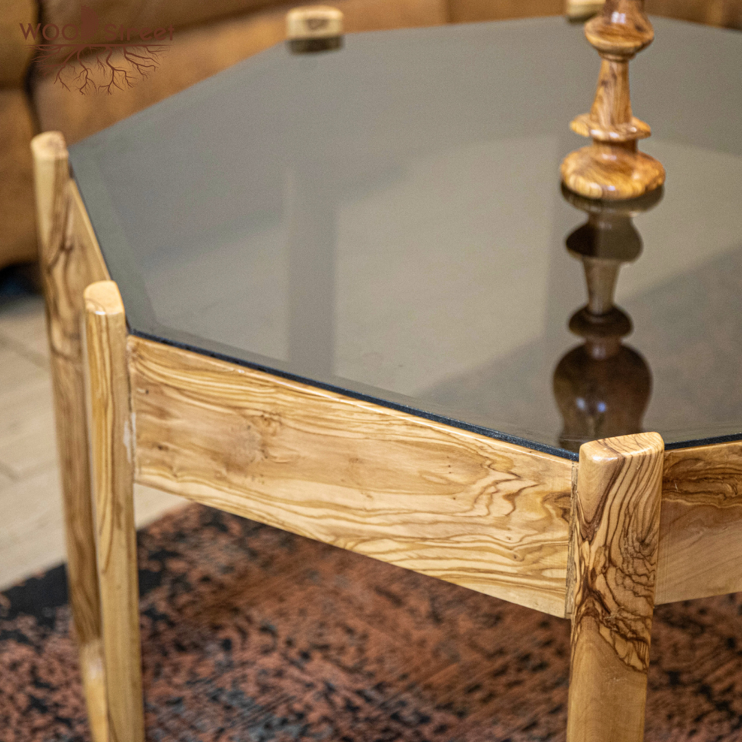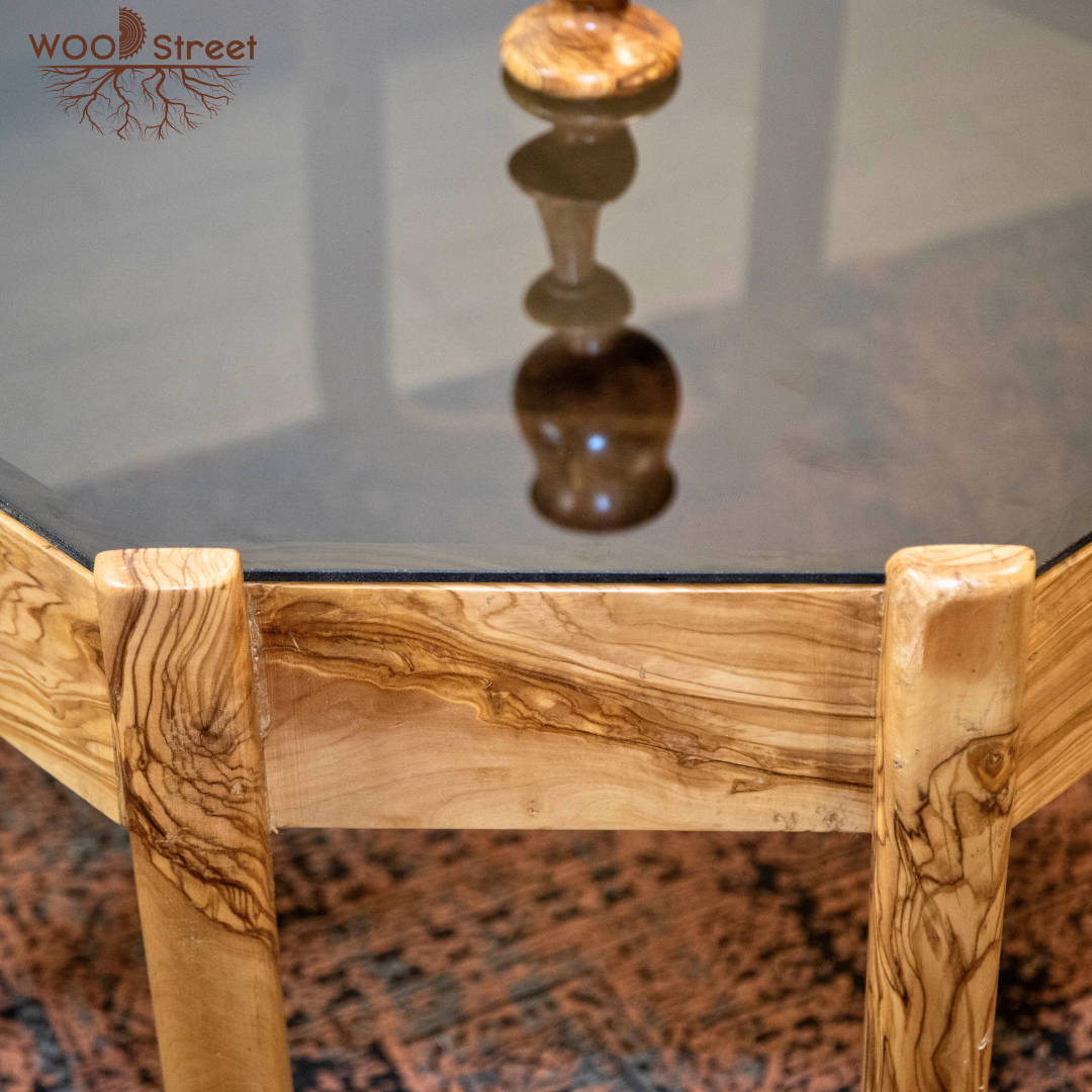 Natural olive wood center table with glass